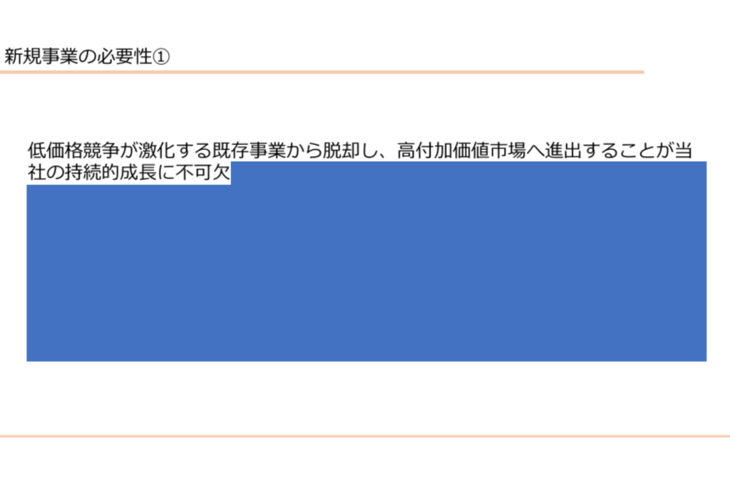 (単に「新事業をやりたい」ではなく、「既存事業で培った〇〇という強みを活かし、市場の△△という課題を解決することで、□□という未来を実現する」というストーリーを明確に示していただきました。)
